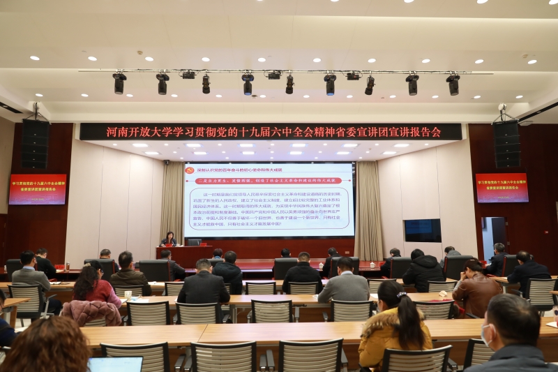 根據(jù)河南省委高校工委、河南省教育廳統(tǒng)一安排部署,1月4日,學(xué)習(xí)貫徹黨的十九屆六中全會精神省委宣講團宣講報告會在河南開放大學(xué)辦公樓二樓會議室舉行。省委宣講團成員、河南職業(yè)技術(shù)學(xué)院黨委書記李桂貞作專題宣講報告。河南省教育廳思想政治工作處處長陳凱、全體校領(lǐng)導(dǎo)出席報告會,學(xué)校各部門主要負責(zé)人、馬克思主義學(xué)院全體教師現(xiàn)場聆聽宣講報告,全省電大系統(tǒng)以網(wǎng)絡(luò)視頻形式參會學(xué)習(xí)。報告會由河南開放大學(xué)黨委書記、校長趙繼紅主持。