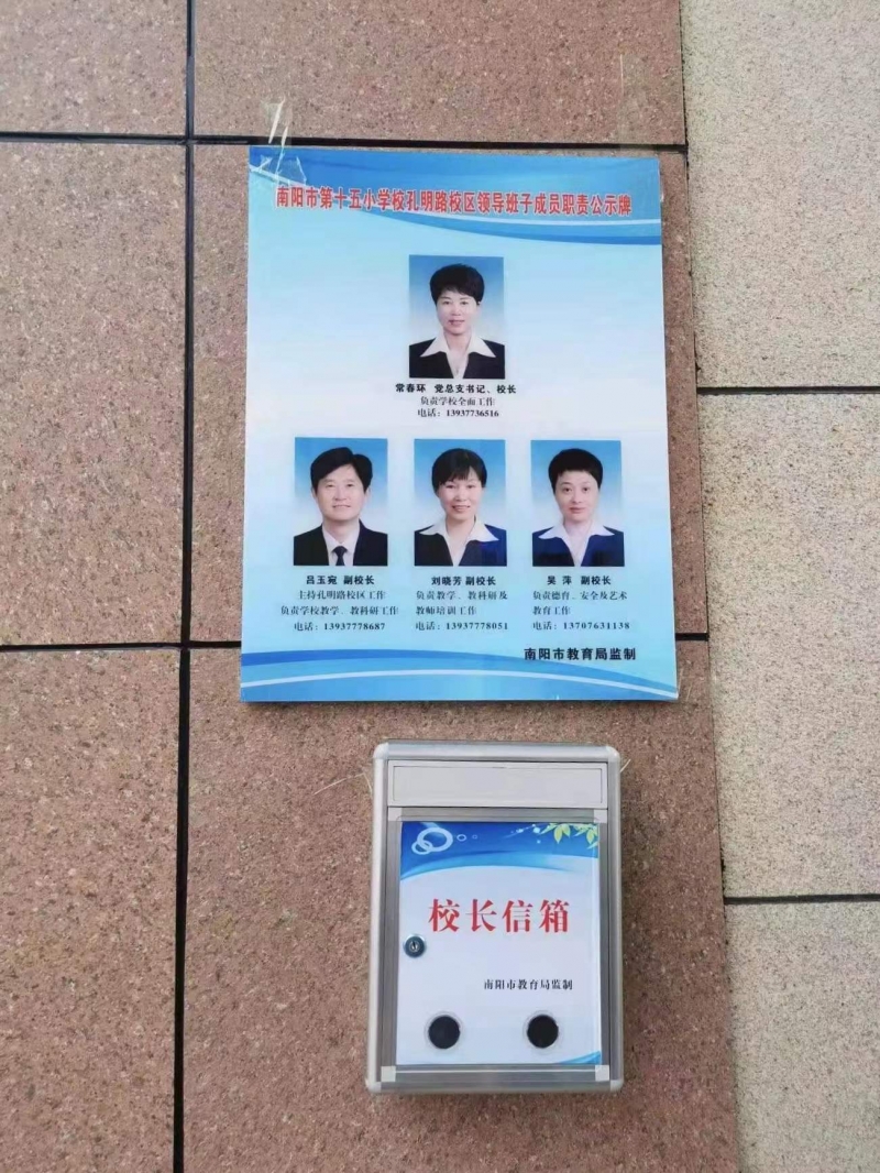 1月12日,記者從南陽市教育局獲悉,為全面優(yōu)化教育營(yíng)商環(huán)境,接受社會(huì)監(jiān)督,聽取家長(zhǎng)師生意見,及時(shí)解決問題矛盾,提高學(xué)校管理能力和服務(wù)水平,市教育局要求局屬各學(xué)校在校門口醒目位置懸掛校長(zhǎng)(園長(zhǎng))職責(zé)公示牌和校長(zhǎng)(園長(zhǎng))信箱。