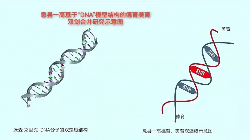 張其煌:陶行知的美育思想和實(shí)踐要求把培養(yǎng)“真、善、美”的人作為教育的最高目標(biāo),把教育事業(yè)作為美的事業(yè)、把以美育人作為教育者神圣的職責(zé)。因此,我們要從真、善、美三個(gè)角度入手,堅(jiān)持立德樹人,立足學(xué)生的實(shí)際生活,開發(fā)美育資源,塑造人的美好心靈。我校不斷研究美育實(shí)施新途徑,探索出“息縣一高基于“DNA模型”的美育和德育研究雙螺旋”道路。(如下圖)