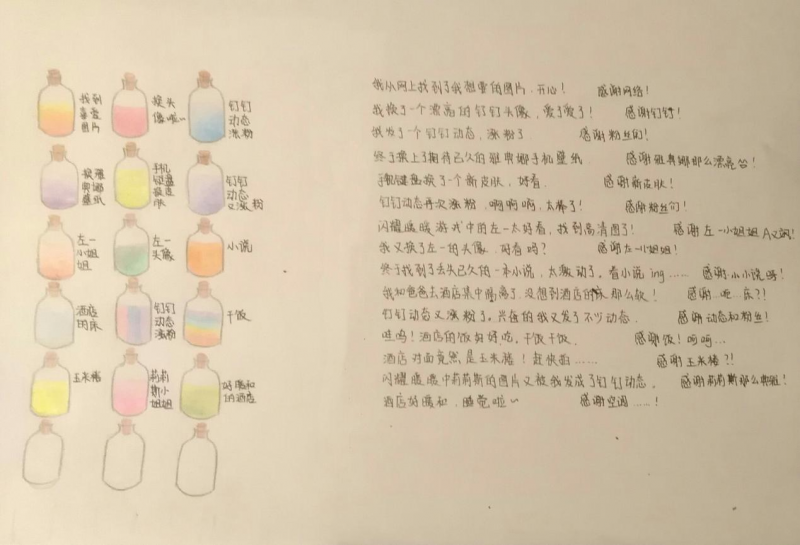 白靜萱:雕塑大師羅丹說過:“世界上并不缺少美,而是缺少發(fā)現(xiàn)美的眼睛。”前天的心理課,恰恰教會(huì)了我們?nèi)绾螕碛羞@雙眼睛。有時(shí)我會(huì)想,如果沒有了情緒,我的生活是不是就會(huì)輕松很多了?上完了心理課,我才有了明確的答案。有多變的情緒并不是壞事,關(guān)鍵在于如何去控制和調(diào)節(jié)情緒。學(xué)會(huì)控制情緒,它不僅不會(huì)困擾你,還會(huì)讓生活更加豐富多彩。同時(shí),“生活不只有眼前的茍且,還有詩(shī)和遠(yuǎn)方。”心理課還教我們要學(xué)會(huì)發(fā)現(xiàn)生活中的美好,比如畫出美好源泉小瓶子,將每天不同的小美好裝進(jìn)一個(gè)個(gè)形狀各異顏色各異的瓶子,我相信不僅在繪制的時(shí)候會(huì)感到快樂,在困難時(shí)低落時(shí)翻開本子,也會(huì)充滿了前進(jìn)的動(dòng)力。這便是心理課堂帶給我的感受,相信上完了這堂課,在今后漫漫人生路上,我總會(huì)有勇氣去面對(duì)困難,擁抱快美好。