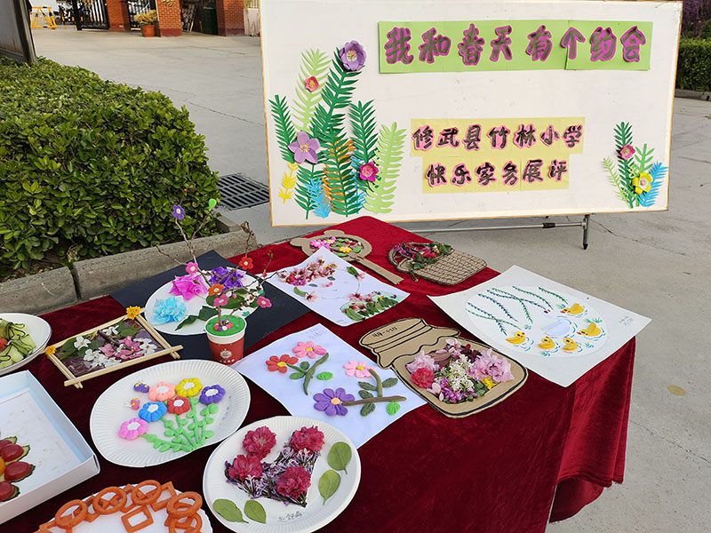此次家務比賽緊緊圍繞孩子的日常生活技能展開,以尋找春天的美為背景,根據(jù)不同年級學生的特點,以班級為單位,分別安排不同的比賽項目,每個年級都有自己的展示項目,比賽項目有:一年級用花擺春天;二年級用蔬菜串花環(huán);三年級用橡皮泥做花饃;四年級用卡紙做花卉;五年級用水果拼春天;六年級用不織布縫春天。同學們借美術(shù)之靈,創(chuàng)自然之美,紛紛利用手中的材料,自己動腦動手,做成了各種各樣構(gòu)思奇妙、新奇有趣的作品,將春天的無窮魅力盡數(shù)呈現(xiàn)。