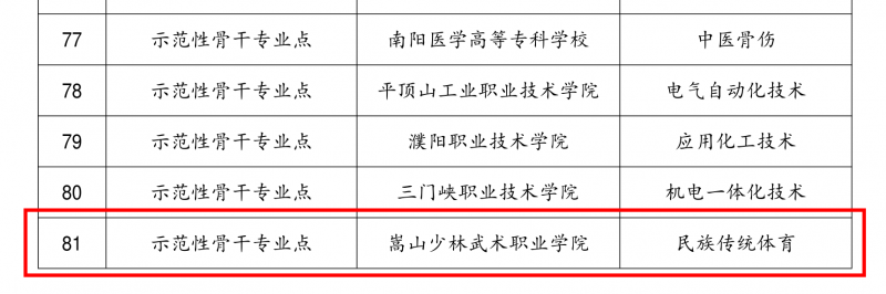 近日,河南省教育廳發(fā)布了《關(guān)于公布 2023年河南省職業(yè)教育示范性專業(yè)點(diǎn)立項(xiàng)建設(shè)項(xiàng)目名單的通知》(教職成〔2023〕131 號(hào))文件,嵩山少林武術(shù)職業(yè)學(xué)院民族傳統(tǒng)體育專業(yè)獲批省級(jí)示范性骨干專業(yè)建設(shè)點(diǎn)。