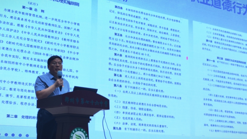 劉忠校長帶領(lǐng)全體教師學習《鄭州市中小學教師違反職業(yè)道德行為處理實施細則》。他在發(fā)言中強調(diào)在教育教學和生活中,教師是學生的引路人和榜樣,我們要時刻保持高度的責任感和使命感,以《鄭州市中小學教師違反職業(yè)道德行為處理實施細則》為指導,做正確的教育、正確地做教育、把教育做正確。鄭州市第七十六中學全體師生簽訂了《師德師風承諾書》簽訂承諾書,重溫人民教師誓詞,學校校級領(lǐng)導,中層領(lǐng)導、各發(fā)展中心主任和副主任、各支部書記委員、年級部主任副主任,在教師座位前面、舞臺下方列隊站立,進行了莊嚴宣誓。