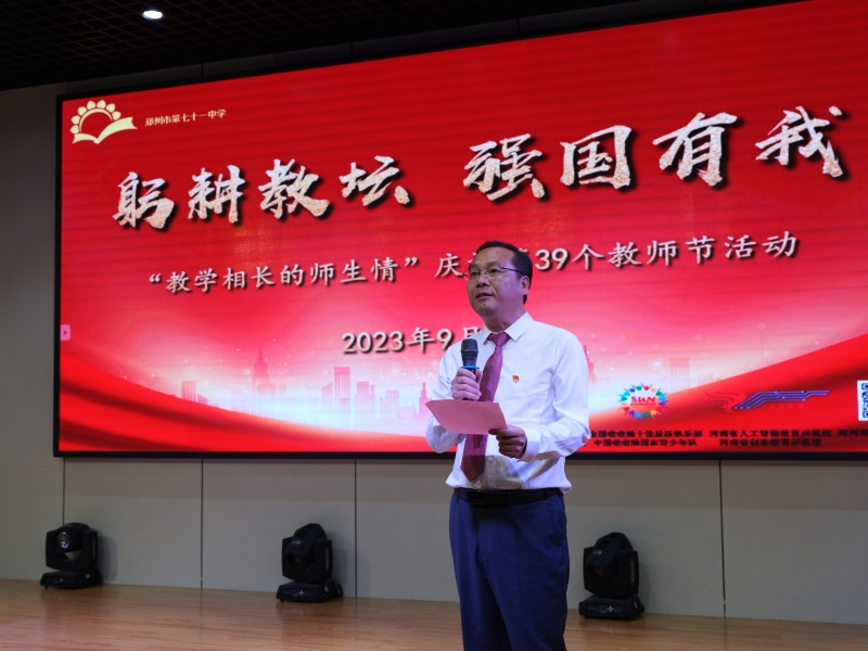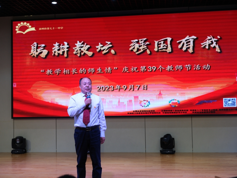 2023年9月7日下午,鄭州市第七十一中學(xué)舉行了“躬耕教壇,強(qiáng)國有我”暨教學(xué)相長的師生情慶祝第39個教師節(jié)活動。在學(xué)校黨總支書記徐建志的帶領(lǐng)下,校領(lǐng)導(dǎo)們手捧鮮花,為走向紅毯的老師們送上鮮花和節(jié)日的祝福。幸福大合影之后,學(xué)校全體教師在學(xué)校報(bào)告廳開展慶祝第39個教師節(jié)活動。