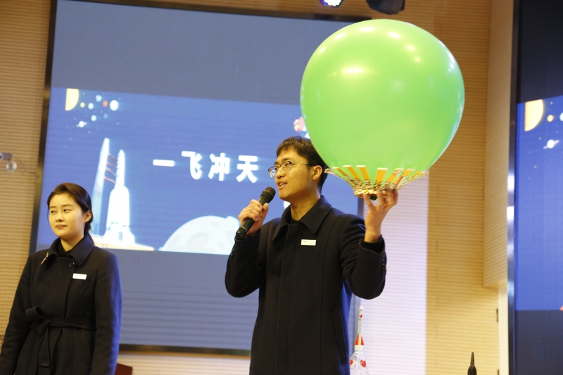 多功能廳的舞臺搖身一變竟成了科學課堂。河南科技館的工作人員給孩子們上了三節(jié)生動的科學課。為了演示并詮釋出火箭的發(fā)射的發(fā)射原理,“奇奇”和“探探”老師用詼諧的語言引發(fā)孩子的思考和探究。有的孩子們還被請上臺來,一起做起實驗來。學生互動一起完成科學實驗表演,現(xiàn)場同學發(fā)出陣陣歡呼和驚嘆,燃起無限探索科學奧秘的好奇心。