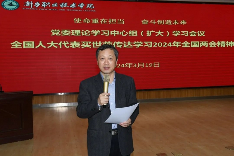 為深入學(xué)習(xí)貫徹全國兩會精神,切實(shí)把全校廣大干部群眾的思想和行動統(tǒng)一到會議精神上來,3月19日下午,新鄉(xiāng)職業(yè)技術(shù)學(xué)院召開黨委理論學(xué)習(xí)中心組(擴(kuò)大)學(xué)習(xí)會議,大會上,全國人大代表買世蕊以“使命重在擔(dān)當(dāng)、奮斗創(chuàng)造未來”為主題,圍繞學(xué)習(xí)貫徹兩會精神,講述自己參加全國兩會的心得感悟,黨委中心組成員及全體中層以上干部200余人聆聽了報告,此次會議由黨委書記張林主持。