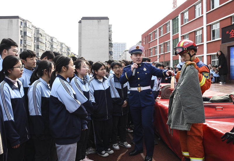 濟源市消防救援支隊的消防員向?qū)W生講解如何快速穿戴滅火防護裝備