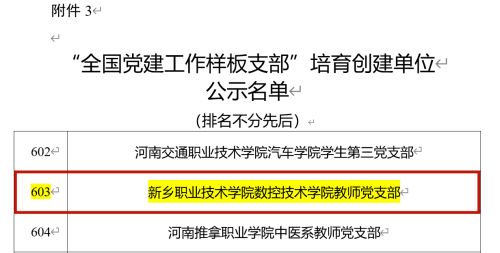 近日,教育部印發(fā)通知,公示第四批新時(shí)代全國黨建工作示范高校、標(biāo)桿院系、樣板支部培育創(chuàng)建單位名單,新鄉(xiāng)職業(yè)技術(shù)學(xué)院數(shù)控技術(shù)學(xué)院教師黨支部獲評“全國黨建工作樣板支部”培育創(chuàng)建單位。