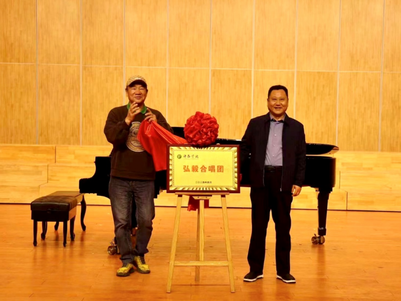 音樂(lè)會(huì)之前,孫海和陳家海共同為許昌學(xué)院弘毅合唱團(tuán)揭牌。音樂(lè)舞蹈學(xué)院黨委書(shū)記楊天宏主持揭牌儀式。