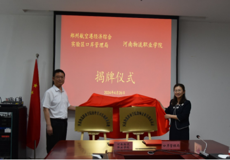 河南物流職業(yè)學(xué)院校長(zhǎng)陶海東與鄭州航空港經(jīng)濟(jì)綜合實(shí)驗(yàn)區(qū)口岸管理局局長(zhǎng)郭利超共同為“河南物流職業(yè)學(xué)院校外實(shí)習(xí)實(shí)訓(xùn)就業(yè)基地”“河南物流職業(yè)學(xué)院教師企業(yè)實(shí)踐流動(dòng)站”揭牌。