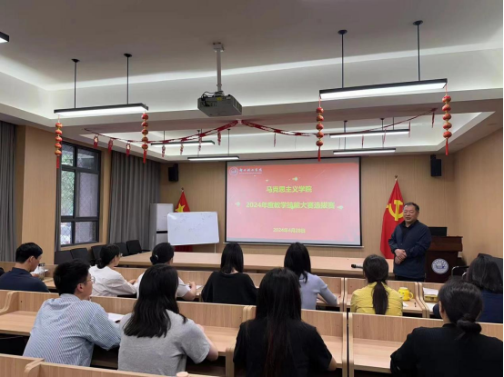 為深入學(xué)習(xí)貫徹黨的二十大精神,提升思政課教師專業(yè)素養(yǎng),按照《中共河南省委宣傳部中共河南省委教育工委河南省教育廳關(guān)于開展2024年度全省學(xué)校思想政治理論課教學(xué)技能“大練兵、大比武、大展示”活動》通知要求,4月28日,鄭州科技學(xué)院馬克思主義學(xué)院在科東會議室101舉行教學(xué)技能大賽選拔賽,全體教師進行現(xiàn)場觀摩。