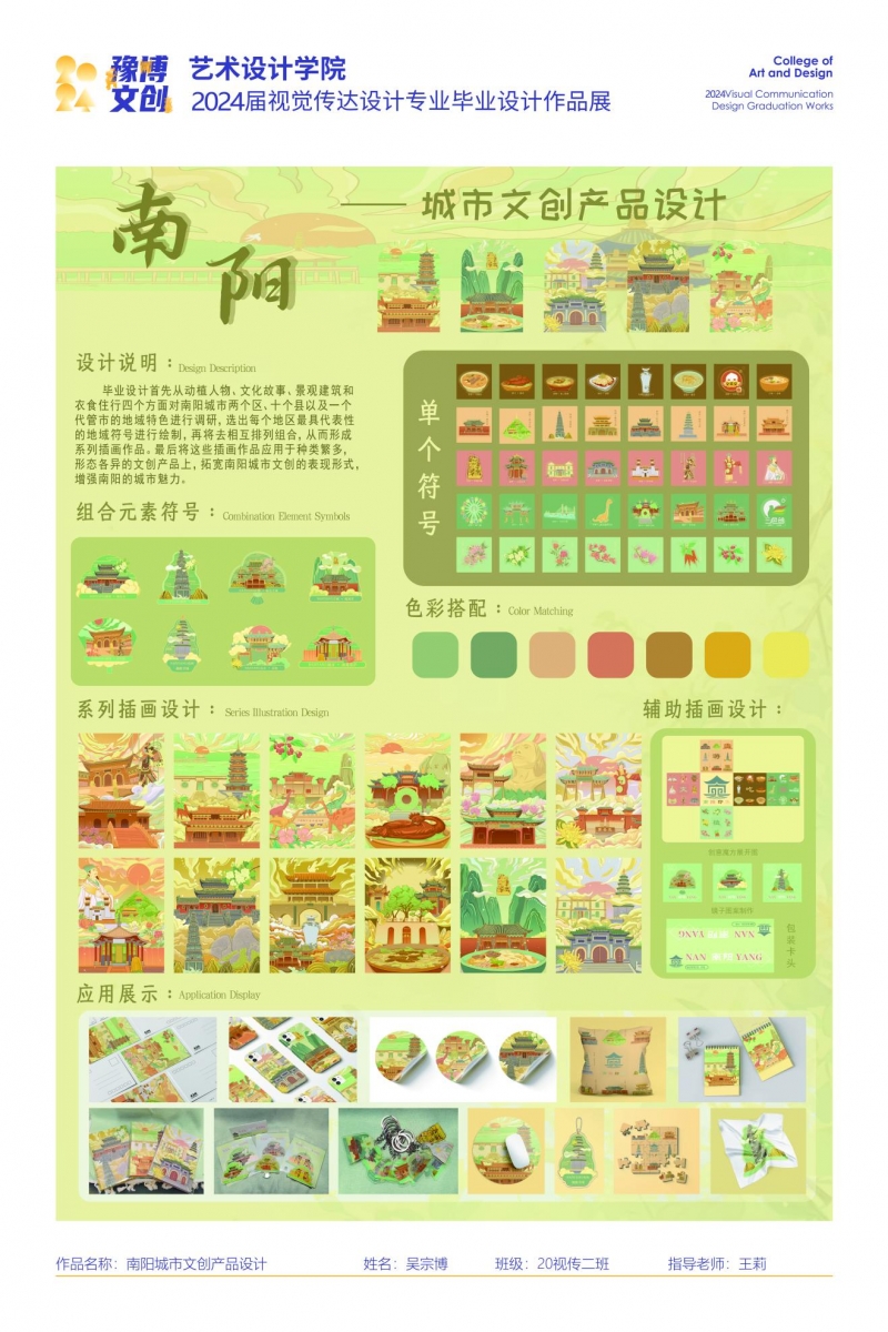 本次畢業(yè)設(shè)計作品展涵蓋了文創(chuàng)產(chǎn)品設(shè)計、品牌形象設(shè)計、IP設(shè)計、包裝設(shè)計、書籍設(shè)計、UI界面設(shè)計等多個方面。其最顯著特點就是緊扣中原文化、圍繞豫博文創(chuàng)板塊選題設(shè)計,獨具匠心展示中原文化的意蘊。“四神瓦當(dāng)”文創(chuàng)產(chǎn)品設(shè)計將河南博物院文物“四神瓦當(dāng)”所承載的四季輪回、四方安寧文化內(nèi)涵,將傳統(tǒng)文化經(jīng)典紋樣與色彩巧妙搭配結(jié)合,進行符合現(xiàn)代審美的新國風(fēng)風(fēng)格插畫設(shè)計,具有創(chuàng)新性、實用性和獨特魅力。“豫想靈瑞”IP形象設(shè)計以河南博物院珍藏的神獸類青銅器為設(shè)計靈感,以神獸類青銅器中的神秘形象和精美紋飾為設(shè)計基調(diào),結(jié)合現(xiàn)代審美和生活需求,創(chuàng)造出獨具特色的文創(chuàng)產(chǎn)品。既尊重歷史傳統(tǒng),又賦予產(chǎn)品新的時代意義。“豫你桐在”IP形象以剪紙效果為主,加以版畫形式的創(chuàng)新,以“焦裕祿精神、蘭考縣、泡桐花”為三大分支進行海報設(shè)計,可以吸引更多年輕人了解蘭考紅色文化和剪紙這一優(yōu)秀國家級非物質(zhì)文化遺產(chǎn)。“豫音裊裊”鄭州方言文創(chuàng)產(chǎn)品設(shè)計以鄭州方言為靈感來源,通過插畫與字體結(jié)合的設(shè)計手法,將這一文化元素融入產(chǎn)品之中,讓更多的人了解和感受到鄭州方言的魅力。“南陽城市”文創(chuàng)產(chǎn)品設(shè)計從動植人物、文化故事、景觀建筑和衣食住行四個方面選出南陽城市兩個區(qū)、十個縣以及一個代管市最具代表性的地域符號進行繪制,形成系列插畫作品,并將其應(yīng)用于種類繁多、形態(tài)各異的文創(chuàng)產(chǎn)品上,既拓寬南陽城市文創(chuàng)的表現(xiàn)形式,又增強了南陽的城市魅力。