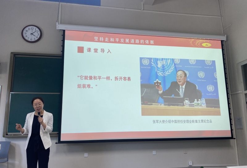 在觀摩教學(xué)中,韓慧敏老師以 “和平基因從何而來?”為題,從文明起源、思想文化、現(xiàn)實(shí)作為三個(gè)方面進(jìn)行了講授。她嫻熟的教法、豐富的教學(xué)內(nèi)容,充分展現(xiàn)了其深厚的理論功底和高超的教學(xué)水平。精彩的講解不時(shí)引發(fā)師生陣陣掌聲。