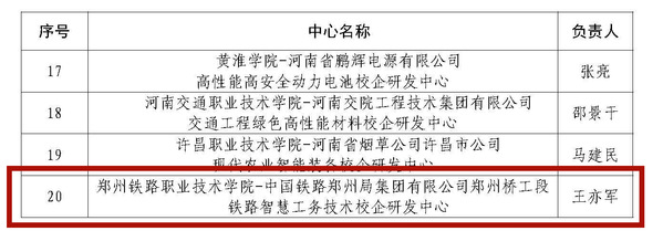 本次認(rèn)定的河南省校企研發(fā)中心(重點(diǎn))共20個(gè),其中高職院校3所;認(rèn)定河南省校企研發(fā)中心25個(gè),其中高職院校7個(gè)。鄭州鐵路職業(yè)技術(shù)學(xué)院王亦軍教授負(fù)責(zé)的“鐵路智慧工務(wù)技術(shù)研發(fā)中心”,充分發(fā)揮鐵道工程學(xué)院專業(yè)優(yōu)勢(shì),聯(lián)合鄭州局鄭州橋工段,聚焦鐵道基礎(chǔ)設(shè)施安全防護(hù)領(lǐng)域“疑難急險(xiǎn)”的病害和災(zāi)害,圍繞鐵路基礎(chǔ)設(shè)施智能監(jiān)測(cè)與診斷、鐵道基礎(chǔ)設(shè)施安全防護(hù)技術(shù)、鐵路運(yùn)維安全與應(yīng)急響應(yīng)三個(gè)領(lǐng)域開展協(xié)作研究。