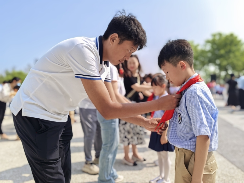 學(xué)校少工委副主任夏艷青宣讀新隊(duì)員名單,在火紅隊(duì)旗的見(jiàn)證下,142名新隊(duì)員光榮地加入中國(guó)少年先鋒隊(duì)。家長(zhǎng)們鄭重地為自己的孩子佩戴紅領(lǐng)巾,新隊(duì)員們臉上洋溢著燦爛的笑容,向家長(zhǎng)們回敬隊(duì)禮。全體隊(duì)員面朝少先隊(duì)旗,在大隊(duì)長(zhǎng)安然然的帶領(lǐng)下莊嚴(yán)宣誓。