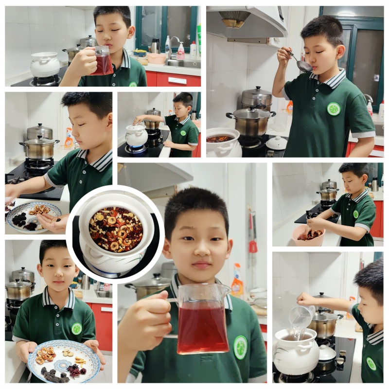 俗話說“芒種夏至天,走路要人牽”,此時來一碗酸甜涼爽的酸梅湯,一定會令人精神大振。三四年級學生和家人一起動手制作酸梅湯,把烏梅、山楂、陳皮、冰糖等食材放在一起進行煮制,一碗碗酸爽可口、消暑解熱的酸梅湯就做好了。品嘗著勞動的成果,一天的疲倦都消散了。
