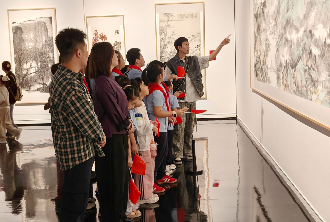 步入展廳,一幅幅精美的藝術作品點亮了同學們的眼眸。社團輔導老師張子軒用心講解作品中的技法與情感寄托。色彩艷麗的花鳥畫,花朵嬌美,鳥兒靈動,不僅展現(xiàn)出畫家對自然生靈的刻畫,更是對美好生活的期許和對祖國昌盛的祝愿。氣勢恢宏的山水畫卷,高山雄偉,流水奔騰,畫家將大自然的壯闊與秀美描摹于紙上,既展現(xiàn)了祖國的秀美風光,又體現(xiàn)了中華民族對自然的尊崇與熱愛。同學們聚精會神地聆聽著老師的講解,不時發(fā)出由衷的贊嘆。