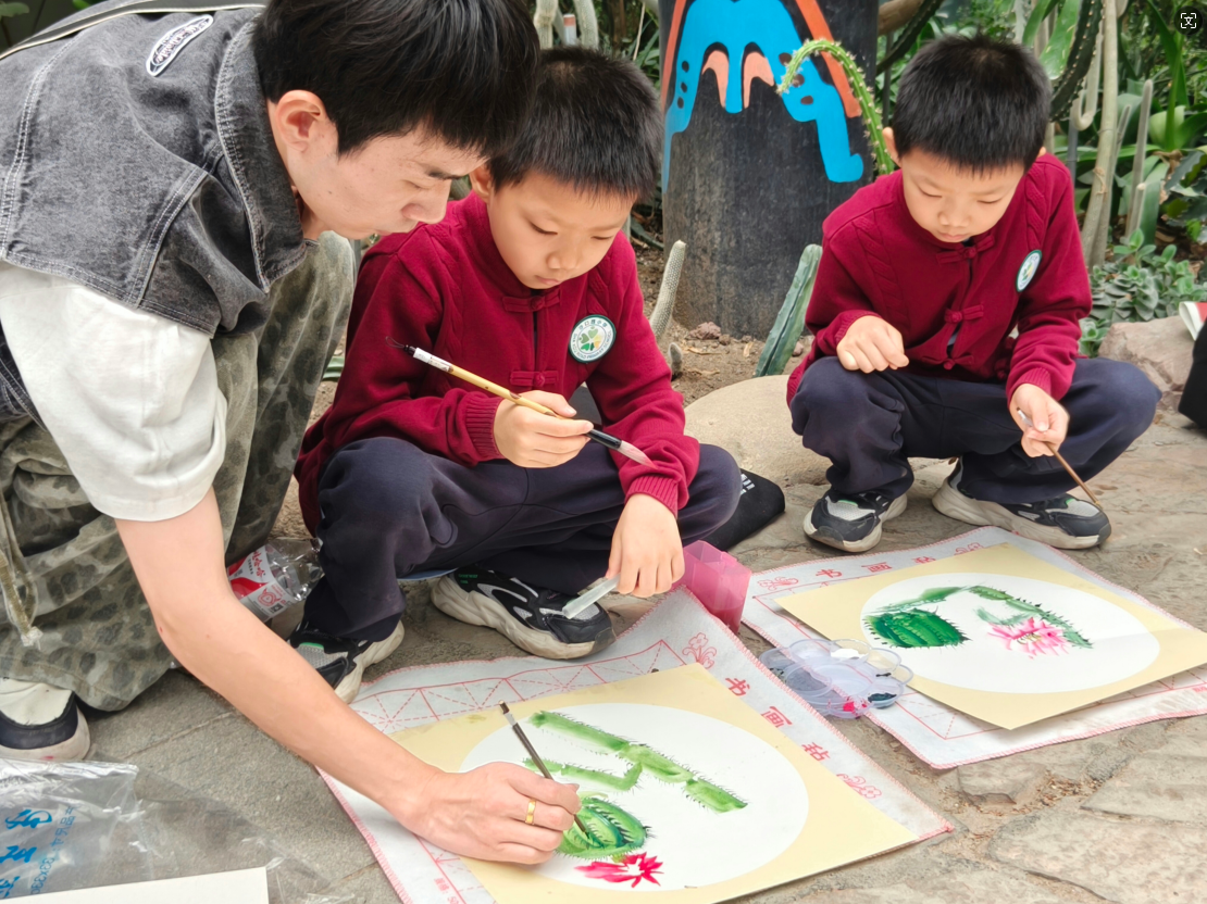 觀展結束,同學們來到植物園進行沙生植物寫生。在張老師的示范講解后,大家紛紛鋪開畫紙,拿起畫筆,沉浸在沙生植物的獨特魅力之中。同學們或是專注地描繪著仙人掌那挺拔而堅硬的刺,或是細致地刻畫出多肉葉片上細膩的紋理和飽滿的色澤。張老師穿梭于學生之間,不時停下腳步,給予個別指導。他耐心地糾正著學生的筆法,講解著如何更好地捕捉沙生植物的生命力和堅韌不拔的精神。在這片自然的懷抱中,同學們用畫筆將自己的赤子之心融入其中。
