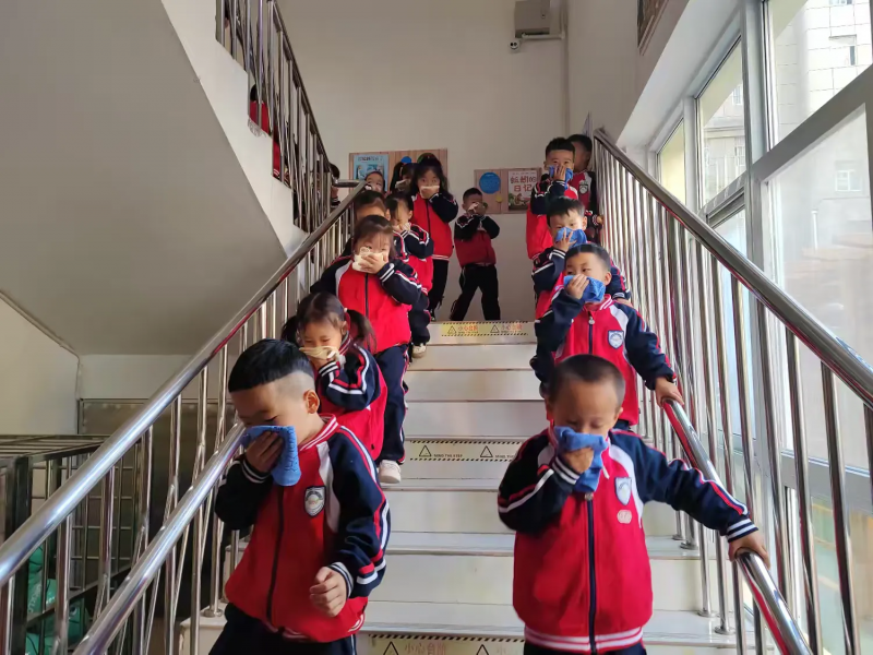 警報(bào)拉響,有序疏散。當(dāng)消防警鈴響徹全園時(shí),所有教職工立即停下手中的工作,各樓道安全員迅速到位,老師們迅速帶領(lǐng)孩子拿起濕毛巾捂住口鼻、彎腰低身,按緊急疏散路線分樓層、分區(qū)域、有秩序地從班級(jí)撤離,疏散到安全地帶。