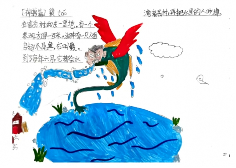 四年級上學期,付澤明快創(chuàng)作完神獸篇時,恰逢學校舉行科技藝術節(jié),在“奇思妙想”專場,他把自己畫的《山海經(jīng)》講給大家聽。趙老師夸他想象力豐富,還說等他創(chuàng)作完成后發(fā)到班級公眾號上。下課后,同學們紛紛圍觀他的作品并稱贊,這大大激發(fā)了他繼續(xù)創(chuàng)作的積極性。