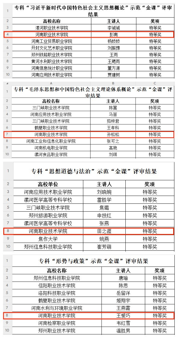 近日,中共河南省委教育工委辦公室、河南省教育廳辦公室下發(fā)了《關(guān)于高校思政課優(yōu)秀課程資源評(píng)審結(jié)果的公示》。河南職業(yè)技術(shù)學(xué)院馬克思主義學(xué)院申報(bào)的2門(mén)課程獲評(píng)示范課程,4門(mén)示范“金課”榮獲特等獎(jiǎng),創(chuàng)歷史最佳成績(jī)。