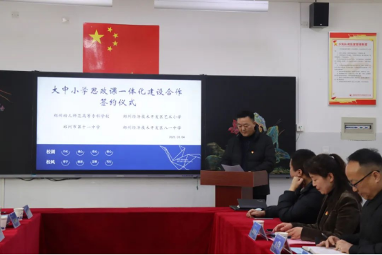 為深入貫徹習(xí)近平總書記關(guān)于思政課建設(shè)的重要指示批示精神,落實(shí)黨的二十屆三中全會(huì)和《教育強(qiáng)國(guó)建設(shè)規(guī)劃綱要(2024-2035)》關(guān)于“推進(jìn)大中小學(xué)思政課一體化建設(shè)改革創(chuàng)新”的重要戰(zhàn)略部署,3月4日,鄭州幼兒師范高等專科學(xué)校與鄭州市第十一中學(xué)、鄭州經(jīng)濟(jì)技術(shù)開發(fā)區(qū)八一中學(xué)和鄭州經(jīng)濟(jì)技術(shù)開發(fā)區(qū)藝術(shù)小學(xué)在鄭州經(jīng)濟(jì)技術(shù)開發(fā)區(qū)藝術(shù)小學(xué)舉行了“大中小學(xué)思政課一體化建設(shè)合作簽約儀式”。
