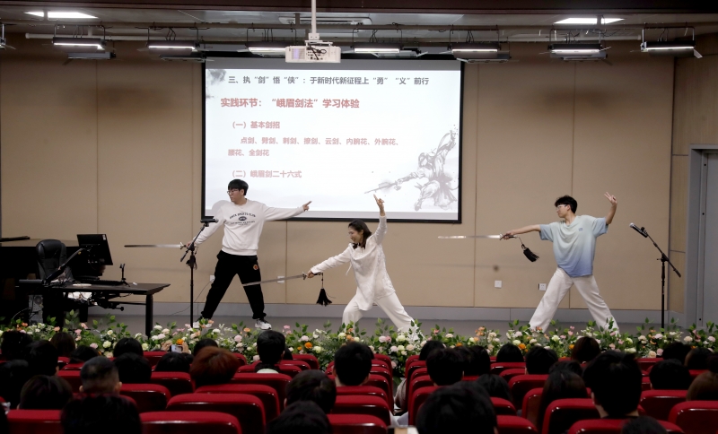“大思政”品牌課程由鄭州輕工業(yè)大學(xué)黨委宣傳部、黨委學(xué)工部、新時(shí)代思想政治教育研究中心、馬克思主義學(xué)院等部門(mén)聯(lián)合打造,本學(xué)期的主題為“故事里的中國(guó)”。第一期課程的題目為“千年‘武俠夢(mèng)’ 仗‘劍’闖天涯”,馬克思主義學(xué)院劉興華擔(dān)任主講教師。課程由電影《射雕英雄傳—俠之大者》的故事導(dǎo)入,闡釋了俠的內(nèi)涵、俠的類別、俠義精神,介紹了“俠客之祖”墨子、“劍俠”李白、“鑒湖女俠”秋瑾,旨在使學(xué)生感悟到俠的本質(zhì)是一種精神和利他的行為,其精神在于“不顧自身安危,救人水火;救人困厄,不留名姓;勇敢無(wú)畏、公正無(wú)私;信守承諾,仁義光明”。課程實(shí)踐環(huán)節(jié)融入了我國(guó)非物質(zhì)文化遺產(chǎn)“峨眉劍法”,通過(guò)教師展示并帶領(lǐng)學(xué)生現(xiàn)場(chǎng)體驗(yàn)峨眉劍法基本劍招和“峨眉劍二十六式”,將抽象的“道理”具象化,使學(xué)生直觀感受到俠的精神、俠的氣魄,以及以“武”增“勇”、以“義”成“俠”的實(shí)踐路徑。