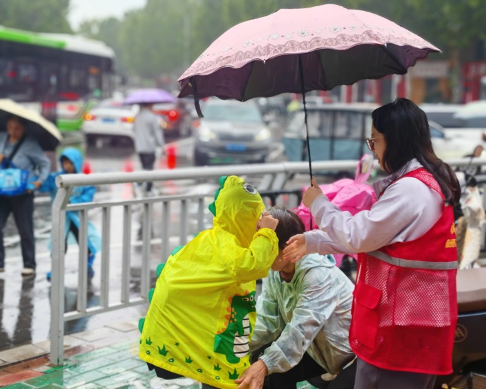 清晨的一場雨,讓校門口的“護學崗”顯得格外忙碌。身著志愿者服裝的家長們早已就位,有的為孩子撐傘,護送他們穿過雨幕;有的在道路旁引導車輛,確保通道暢通;還有的細心提醒奔跑的孩子注意腳下安全……這些看似平凡的舉動,共同構(gòu)成了“鳳翼護學崗”最動人的畫面。