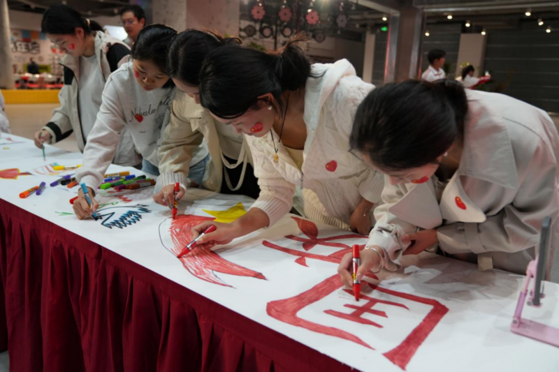 活動在金博大Live一樓中庭舉辦,76名經(jīng)貿(mào)學子揮舞國旗,共同合唱歌曲《我愛你,中國》。深情的歌聲,悠揚的旋律,大家以歌傳情,表達著對祖國母親的無限熱愛和美好祝愿。在歌聲中,來自河南經(jīng)貿(mào)職業(yè)學院數(shù)字創(chuàng)意學院的76名學生站在76米長的畫卷前,以集體藝術(shù)創(chuàng)作的形式,完成國慶主題長卷繪畫。莊嚴肅穆的天安門城樓,蜿蜒起伏的萬里長城,遨游天際的航天飛船……這些元素勾勒出國家繁榮發(fā)展的壯闊圖景,也把活動推向了高潮。